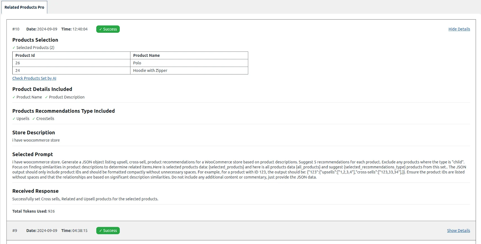 - Detailed View: By clicking on the “Show Details” link next to each log entry, you can view a detailed breakdown of the request. This includes the upsells, related products, and cross-sells that were set during that specific interaction.