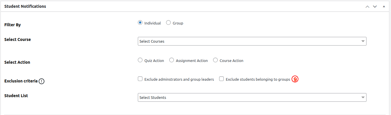 - Exclude Students Belonging to Group: Available when filtering by the individual, this option excludes students belonging to any group, keeping only independent learners in the filtered list.