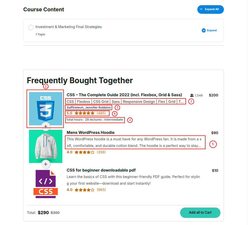 This explains how different configuration settings affect the appearance of the FBT widget. Depending on your selections, the widget can display elements such as the course thumbnail, author name, skill description, course details, product short description, and ratings. These details are dynamically sourced from LearnDash or WooCommerce/EDD based on your setup.