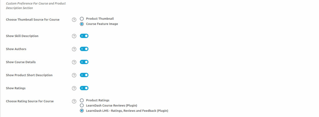 In FBT you can customize how course and product information is displayed in the FBT widget. Choose the thumbnail source, enable or disable additional course details like skills, authors, and descriptions, and select the preferred rating source for the course section.