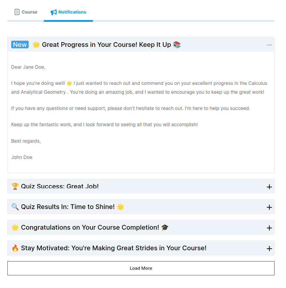 This provides learners with a clean and organized interface to view all course-related updates. The layout is designed to be simple, intuitive, and user-friendly.