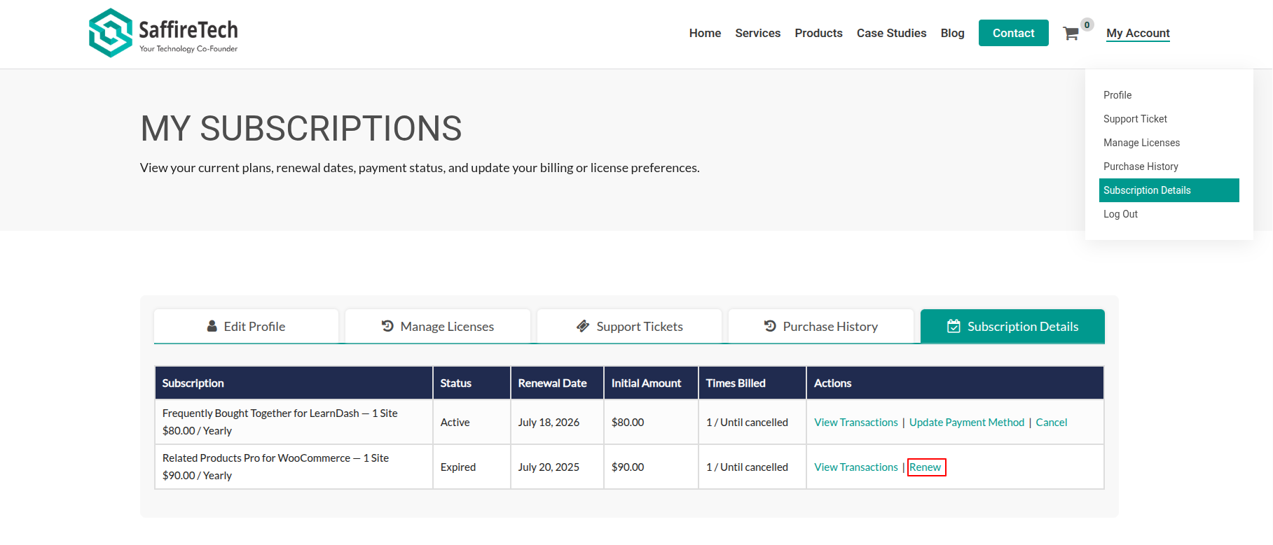 - In the “Action” column for the expired subscription, click on the “Renew” link (if available).