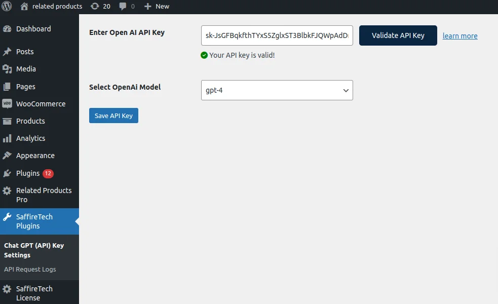 - After installing the Related Products Pro for WooCommerce plugin, on your WordPress dashboard, go to SaffireTech Plugins ->Chat GPT (API) Key Settings. Here you will be asked to enter your Open AI API key and choose its model.