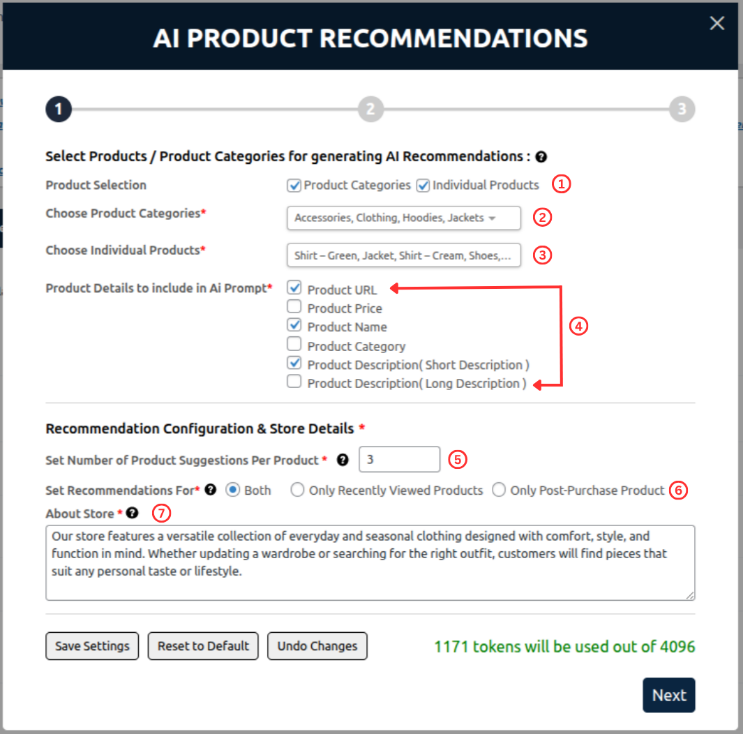 Step 1: The first step involves selecting Products or Product Categories for generating AI recommendations, along with configuring Recommendation Settings and Store Details.