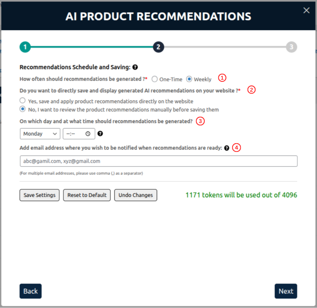 This allows you to schedule the day and time for when the AI should refresh and save new product recommendations. Choose the day of the week when the AI will update recommendations. Set the specific time of day when the AI will update the recommendations. - Notification Email: