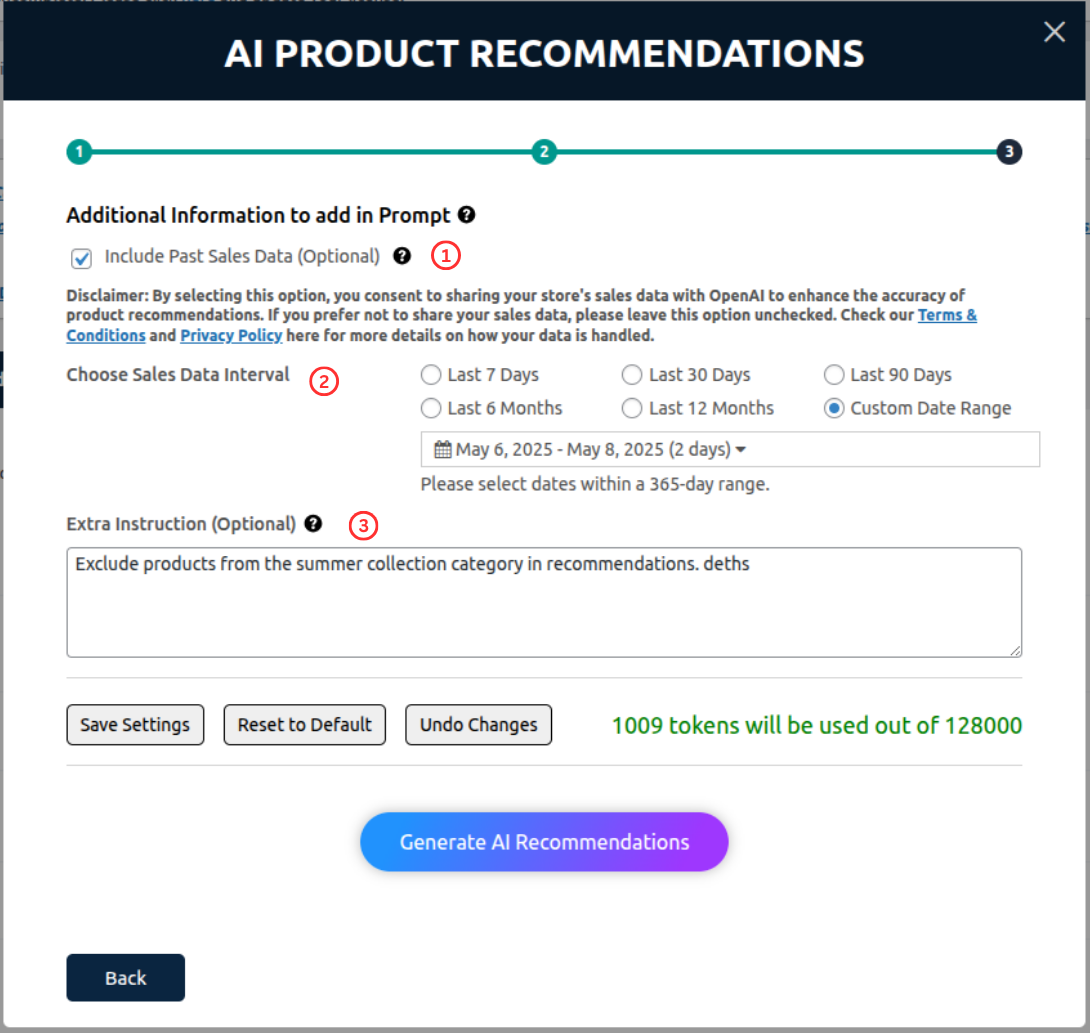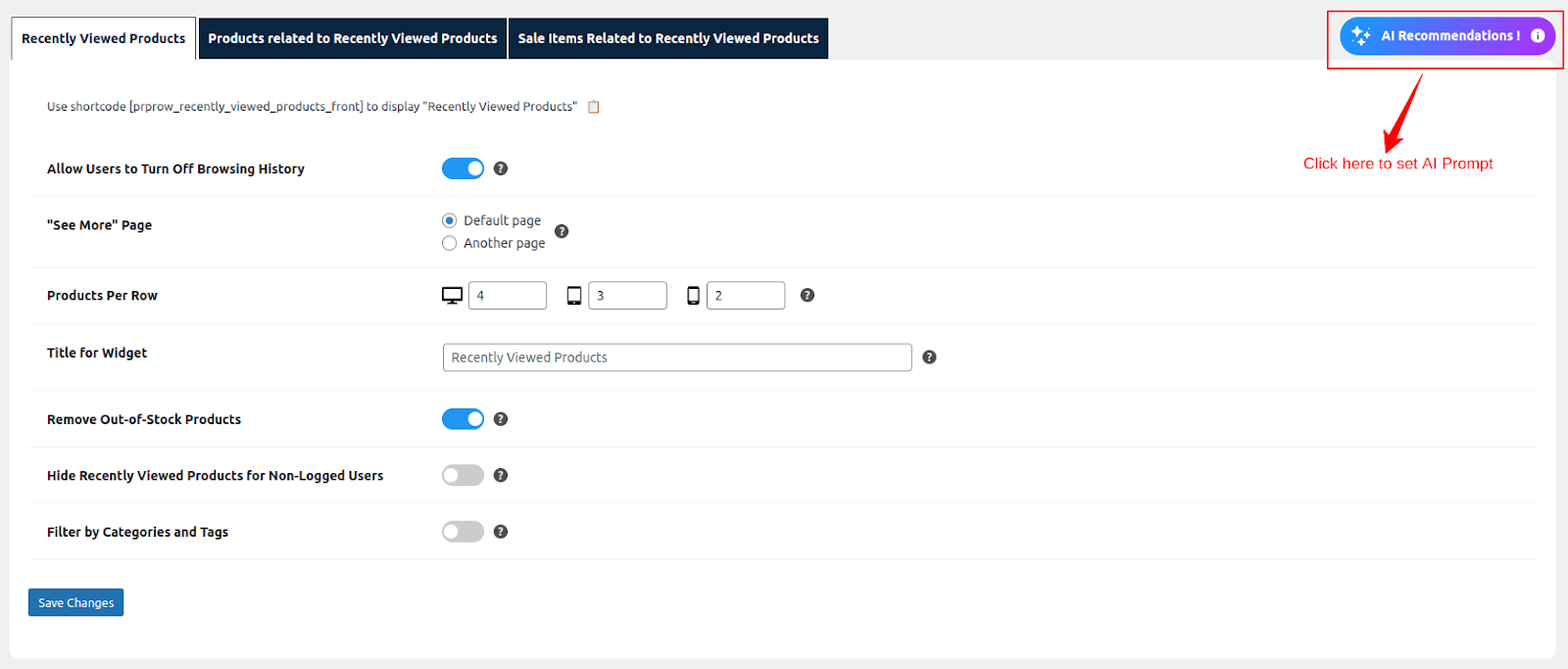 - Generate AI Recommendations: Saves the current settings and sends a request to generate AI-powered product recommendations.