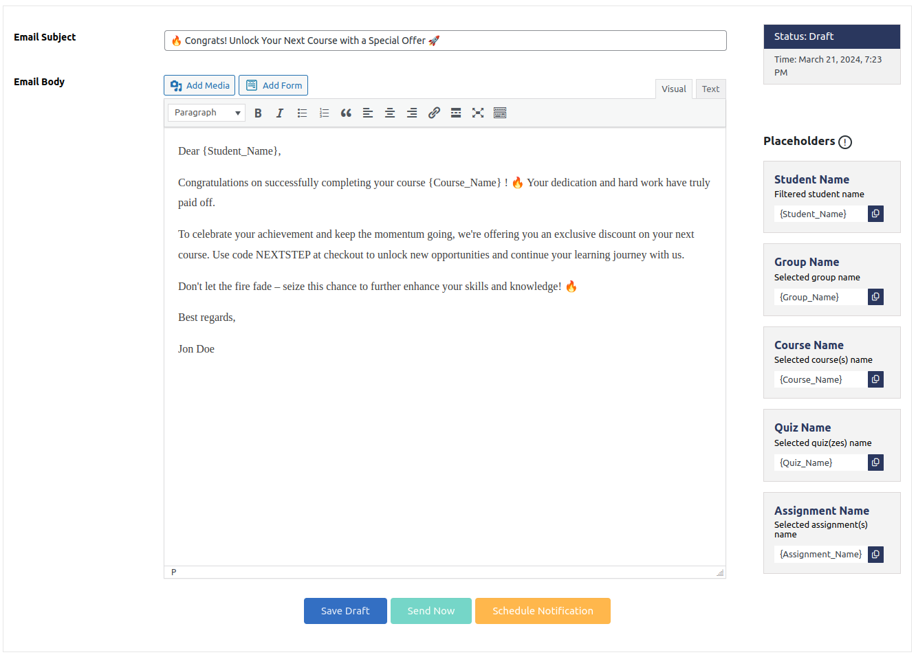 With these options, the Email Notification Editor gives admins complete control over when, how, and to whom notifications are sent, while ensuring a personalized experience for every student.